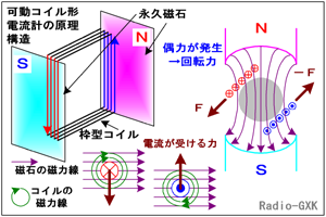 電流が流れると、フレミングの[ア]の法則に従った電磁力により、可動コイルに駆動トルクが生じる。 |