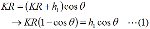 まず、Fig.HI0404_aのように、送受信アンテナ高G1P1、G2P2をそれぞれh1 [m]、h2 [m]とします。等価地球半径KRは8,490 [km]です。こうしてしまえば、電波の経路は直線になりますので、幾何学的に問題を解けばいいことになります。 送信点から電波が地表すれすれを通る、C点までの距離をd1 [m]とし、∠COG1=θ [rad]とします。この図形でd1がいくらになるか、を解いて、受信側も全く同様にd2を求めて両者を足せばいい、という算段で進めます。 △COP1において、各辺の長さについては、